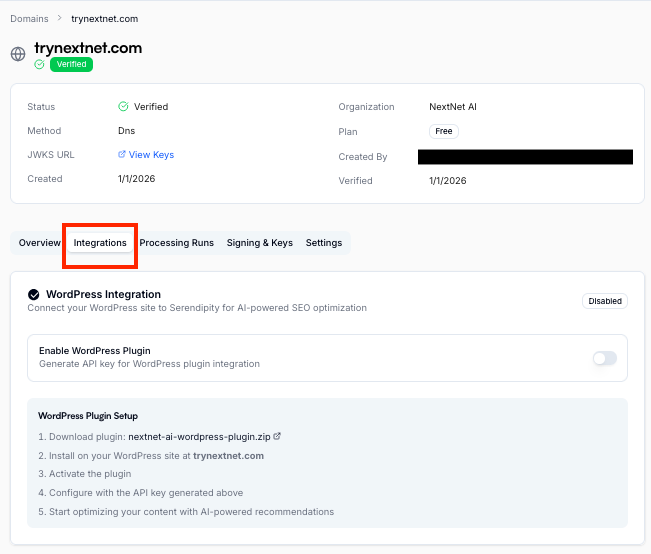 Click on the Integrations tab within Domains to show the section which starts with WordPress Integration.