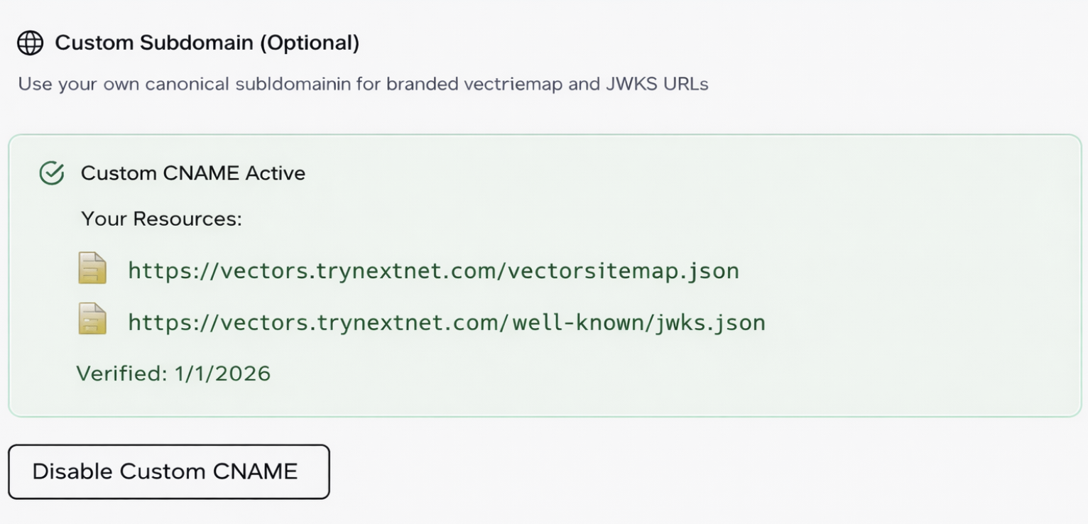 With all NextNet AI accounts, we create and host your Vector Sitemap and JWKS (jwks.json is a standardized JSON file that acts as a public repository for cryptographic public keys). You will now need to have them served on your website.