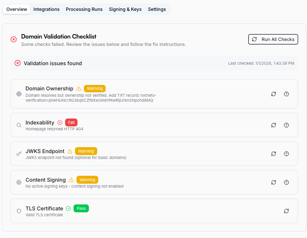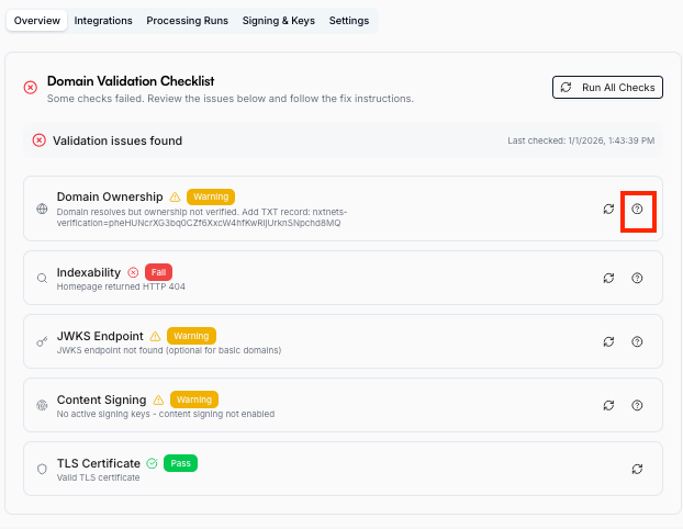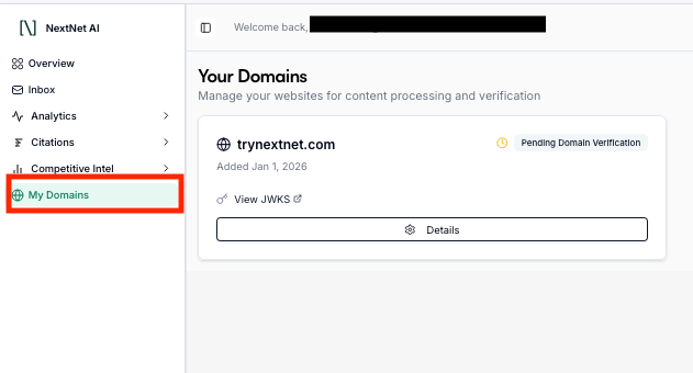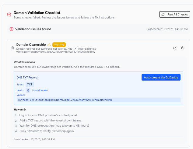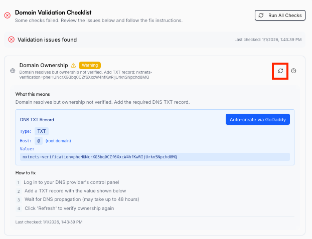 Refresh the Domain Ownership section to have NextNet AI validate your domain ownership.